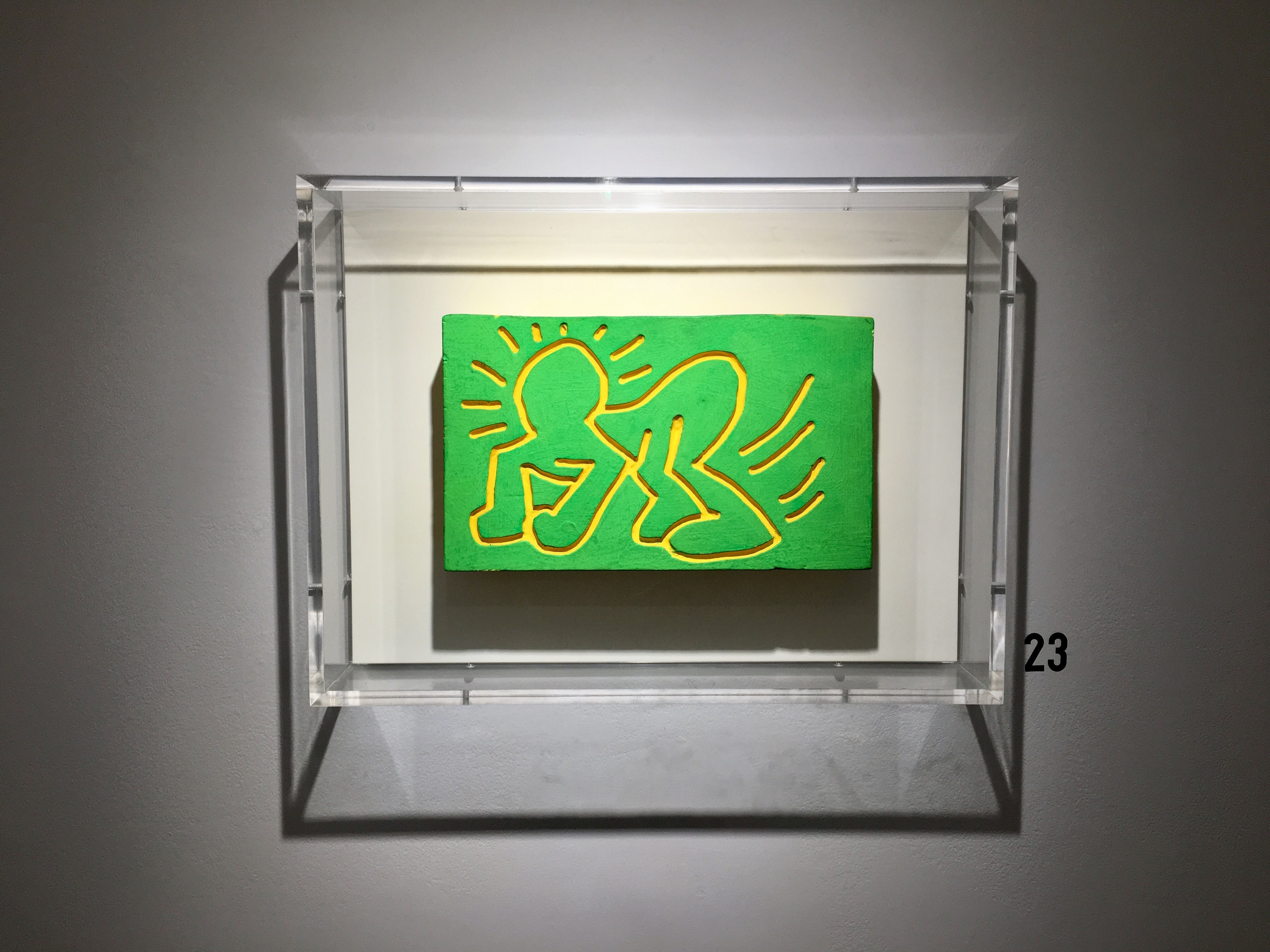 Another similarity between our show and Liverpool is the wood carving pieces kept in Perspex. We have an original carved piece of a glowing baby, and in Tate, you can find the three- eyed face. Both glowing babies and three-eyed faces are common themes in Haring’s practice. The baby carving currently on disply in the gallery demonstrates the early depictions of the figure, whose form is more adult than the plumper infants seen later in Haring’s work. Haring gifted this work to fellow artist and long-time friend, Dan Friedman, dedicating it on the reverse in black marker pen, "For Dan - Love, Keith 1984".