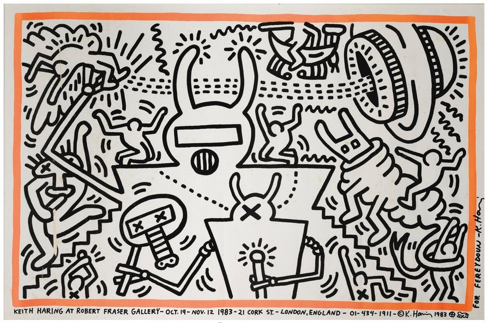 The patterns and single line aesthetic became the signature style of Haring's works. The original drawing pictured on our Robert Fraser Gallery poster was also spotted at Tate Liverpool. The drawing showcases robots and flying saucepans and was used as a gallery poster for Haring’s exhibition in London in 1983. Our edition is framed, signed and dedicated to the famous Iranian artist and curator Fereydoun by Keith Haring itself.
