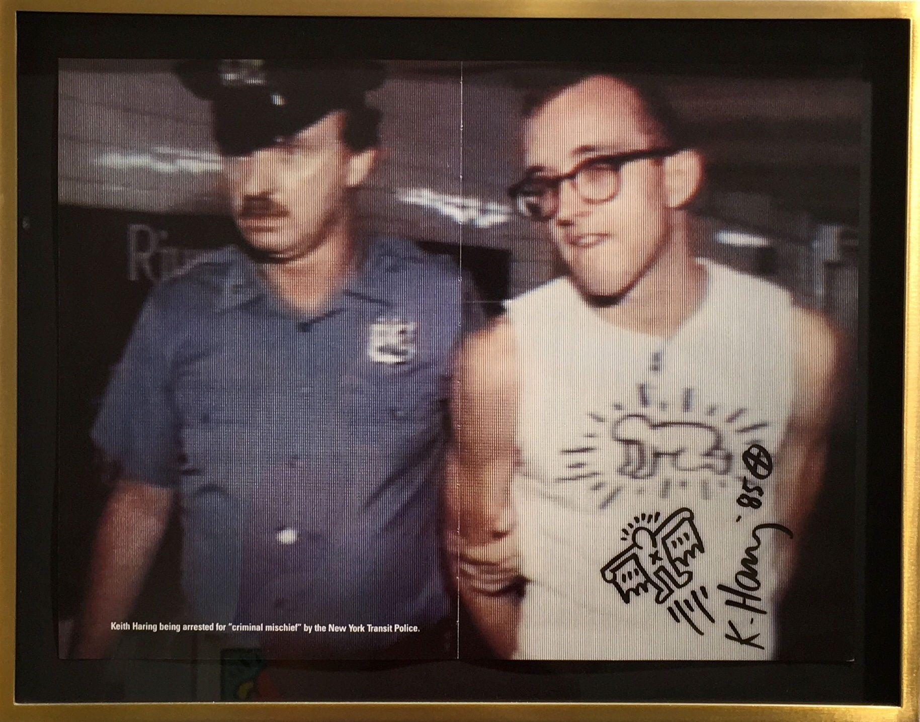 We currently have a printed photograph of Haring being arrested for producing work in the subway which includes a drawing by Haring, signed and dated from 1985. This framed signed historical shot is available to purchase, through us.