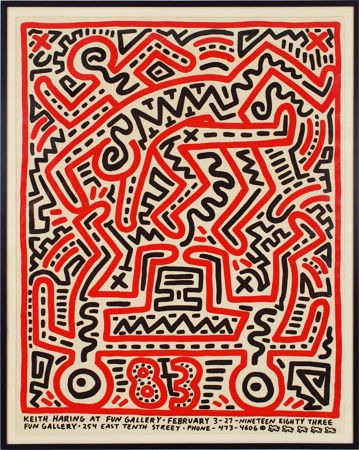 In 1978, Haring began developing his practice, finding inspiration and influences from Japanese calligraphy, Aztec symbolism and ancient Egyptian hieroglyphs. These influences can be seen in Haring’s aesthetics and patterns in pieces such as the Fun Gallery poster from 1983, hanging both in the gallery and the Tate Liverpool.