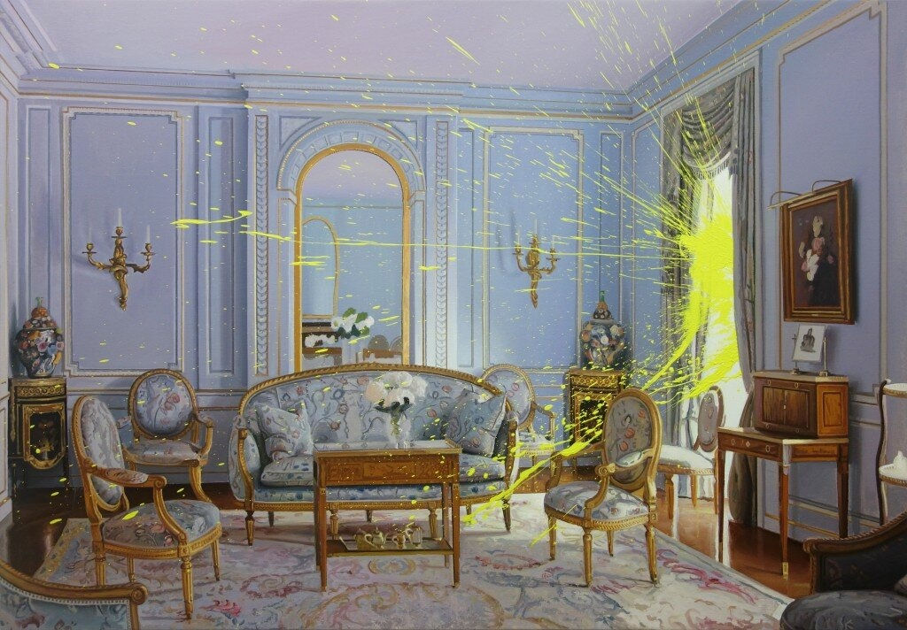 In the series Attacks, Lago painted a series of European stately rooms which were violently disturbed with a spray of neon splattered paint. In the series Paint Over Paint, Lago starts to experiment with contemporary painting over more traditional and classical aesthetics, using large abstract blocks in bright and fresh colours. Fake Abstract is the most recent series of paintings, in which Lago paints European classical-style portraits, which are interrupted by a bold geometric design, giving the work a contemporary feel. Lago also created a print edition from this series last year with RHODES.