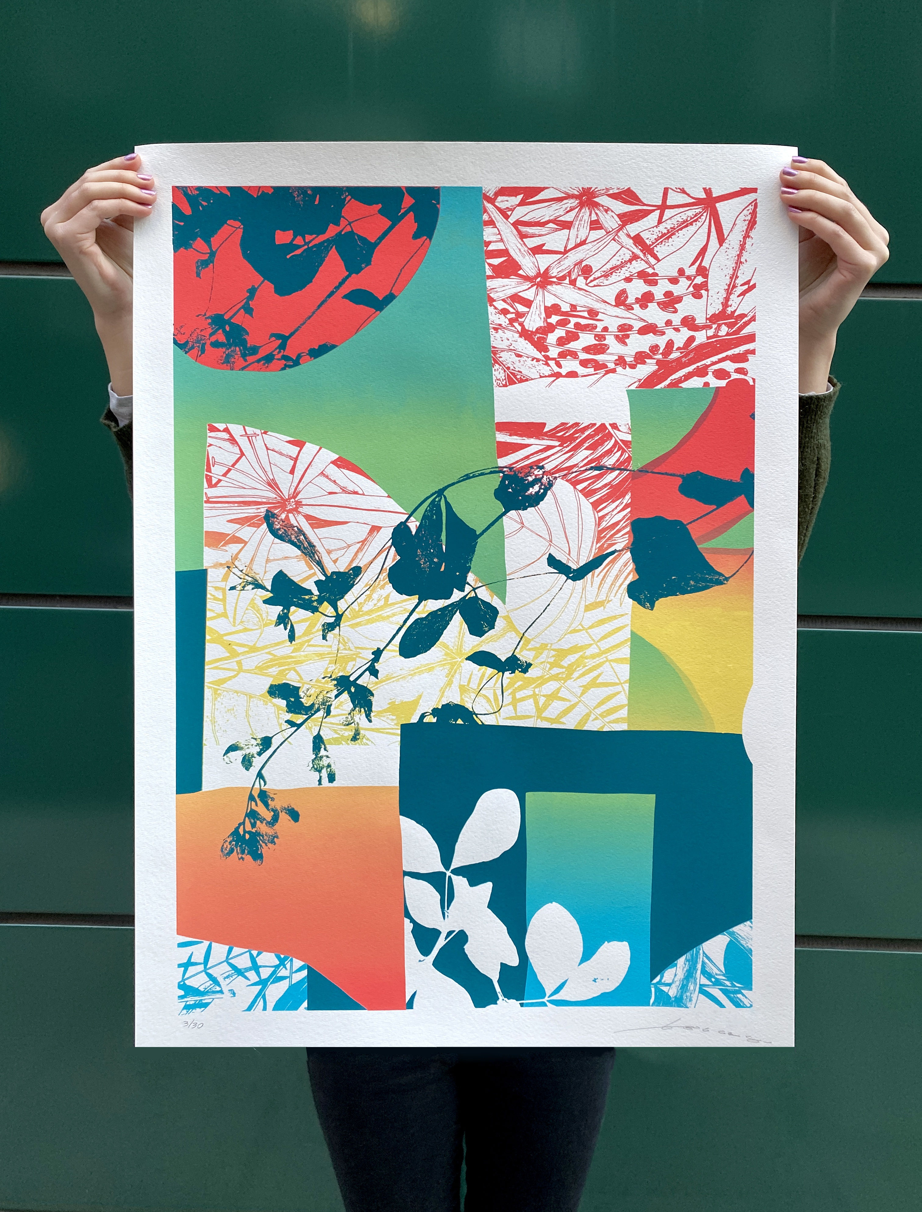 The print is a four-colour screen-print on Hahnemuhle paper, with gloss detailing. The floral motifs are highlighted in the foreground against a tropical gradient of tones. ‘Superbloom’ has a deep and warm intensity of colour and detail, whilst showcasing the artist’s stylistic drawing style.