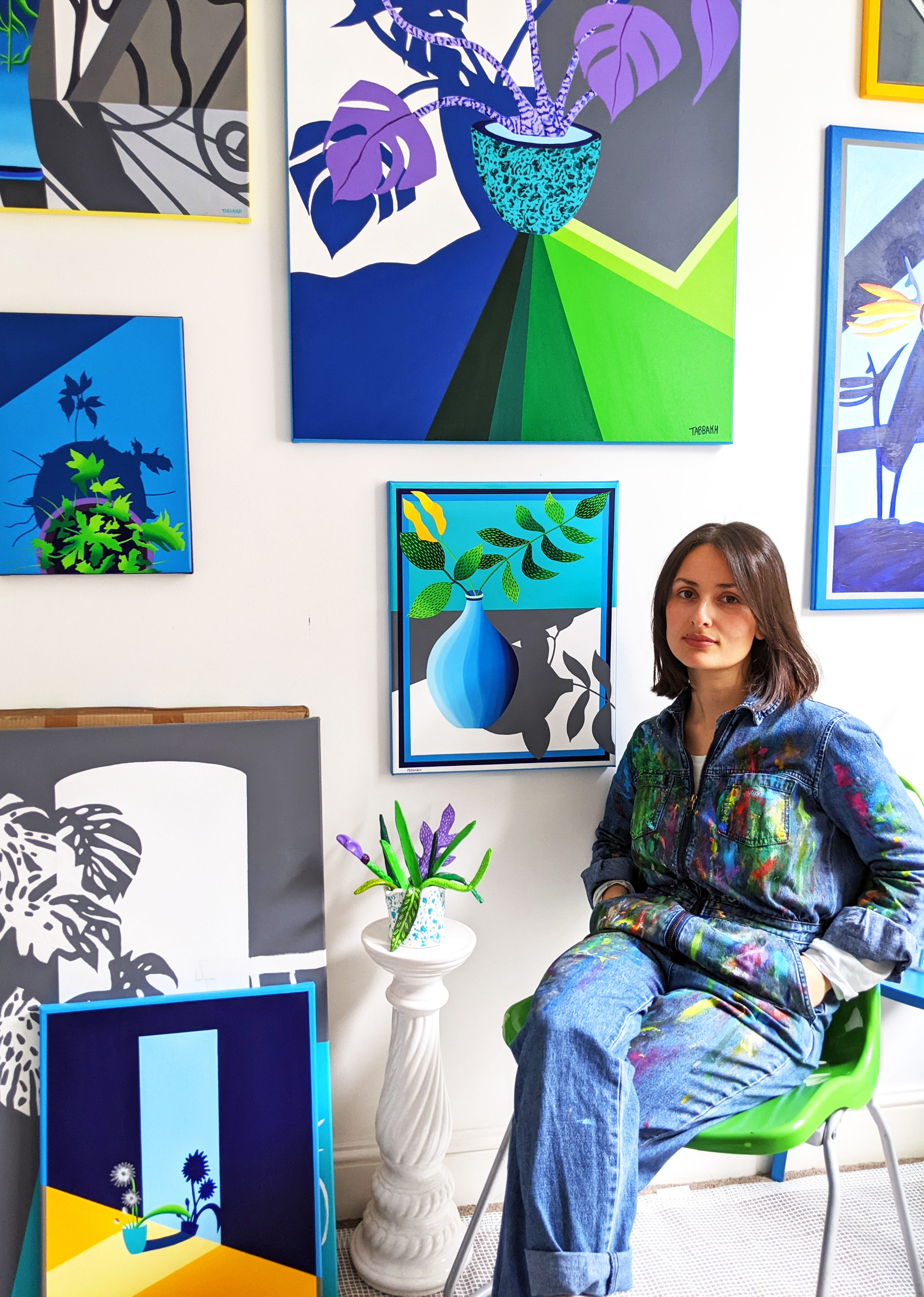 I have aways loved interior design and I grew up watching and helping my dad garden and grow flowers, fruits, and vegetables at home. Since I was a child, my mum always grew plants around the house, sometimes too many. I get my deep love for plants from her. For the last decade I started collecting objects such as pots, vases, surreal objects that I find in flea markets or charity shops. I love to give them a new life on the canvas.
