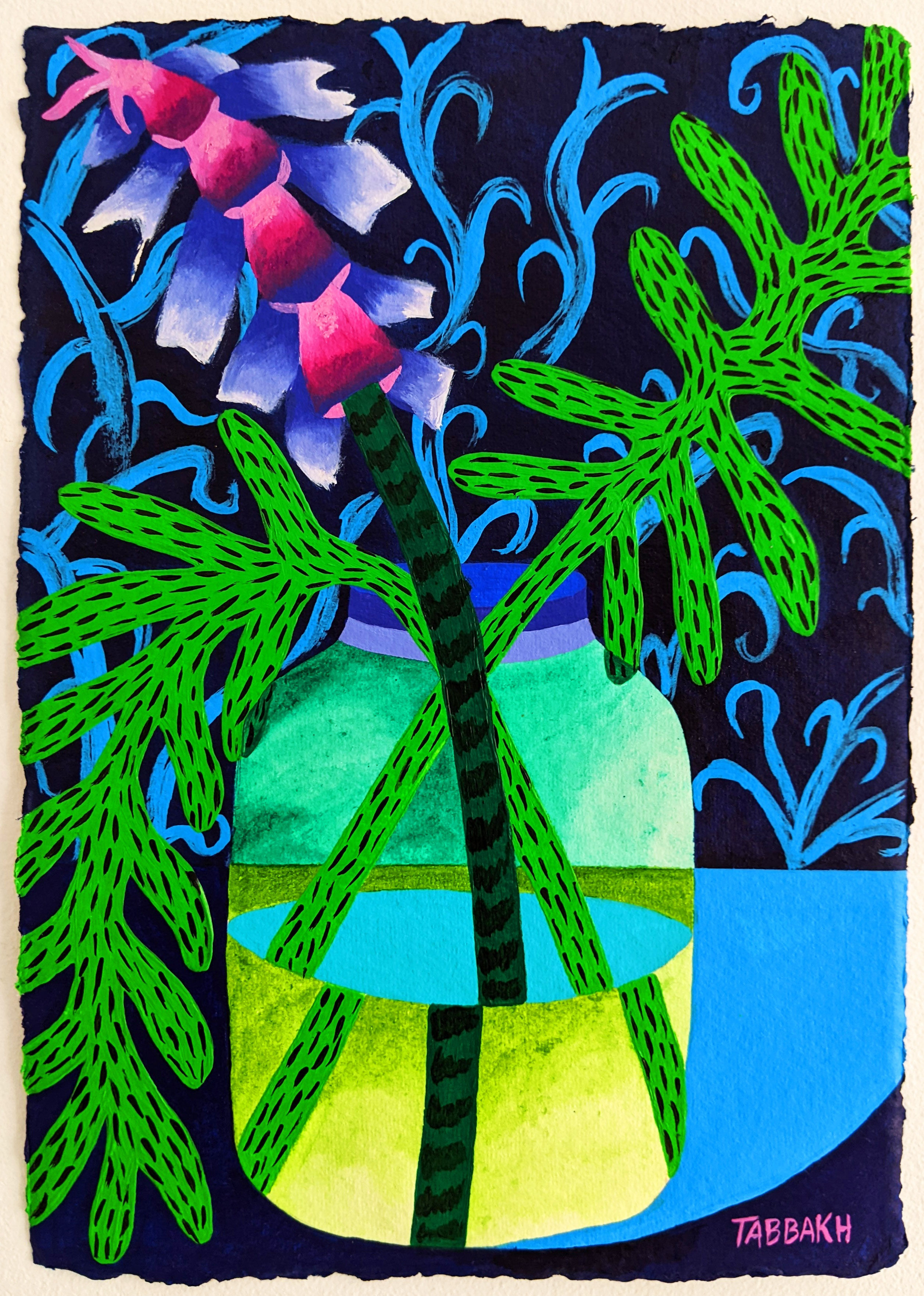 Tabbakh mainly uses pots, vases, plants and surreal objects from her home as inspiration. This is an element that has been forged due to the lockdowns which, like so many of her creative contemporaries, pushed her to simply look around and find inspiration in the everyday objects that can easily be forgotten.