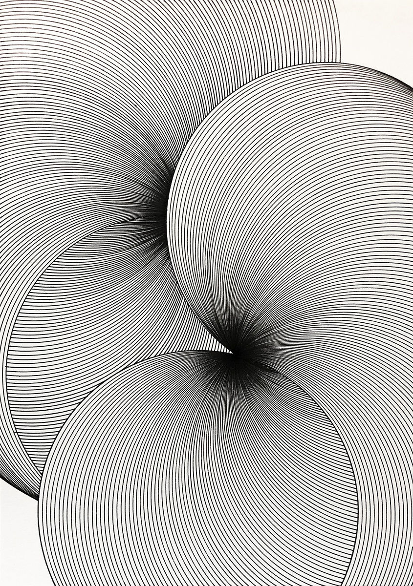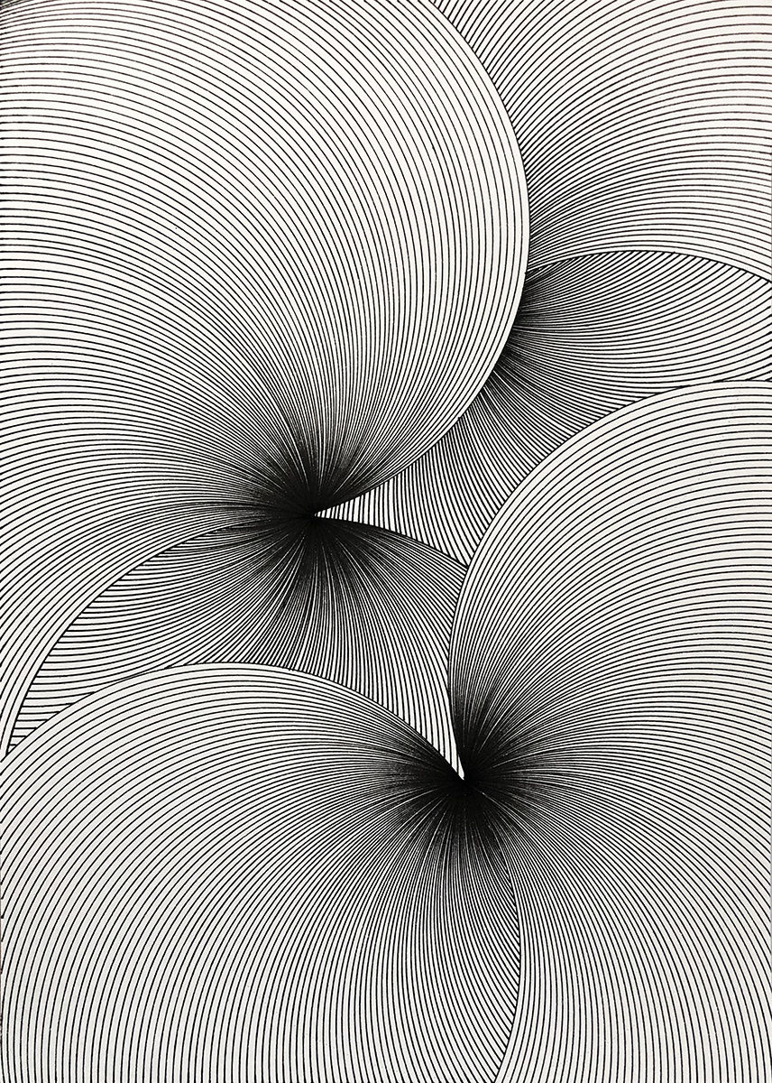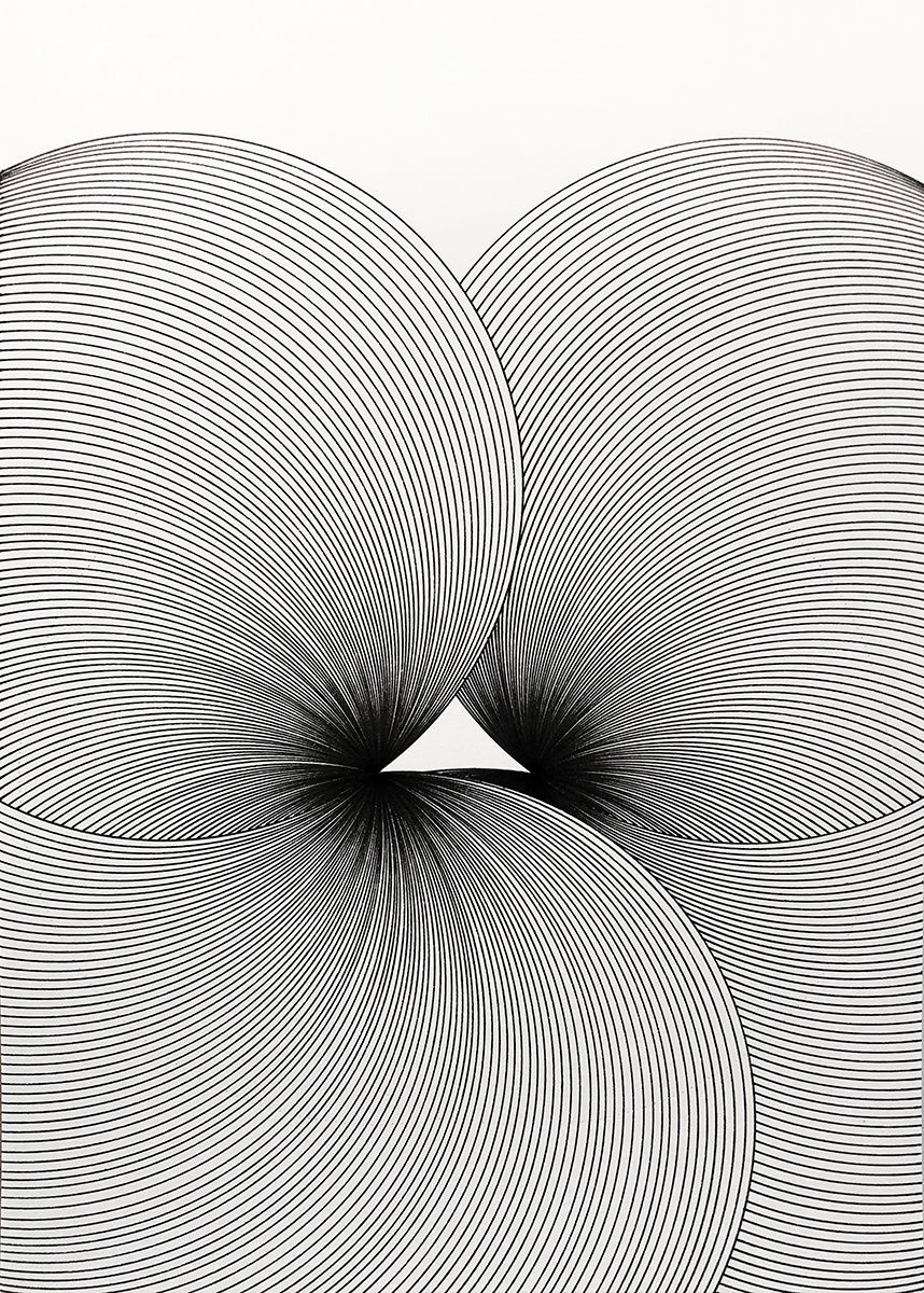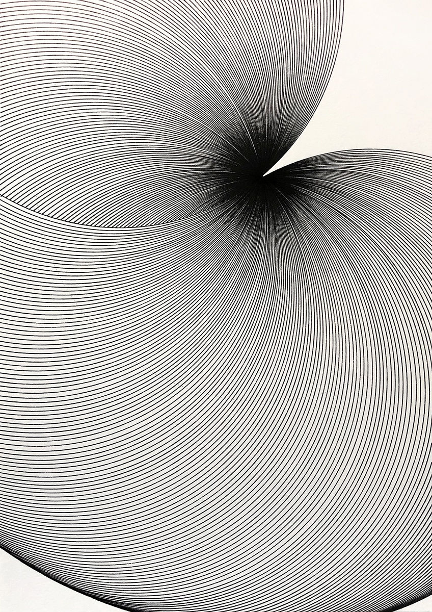 Created with the repeated and continuous movement of drawing, moving a compass around the paper, Stempel’s abstract works are calming and considered. Taking their time to shift over the paper, they offer the viewer a moment of contemplation.