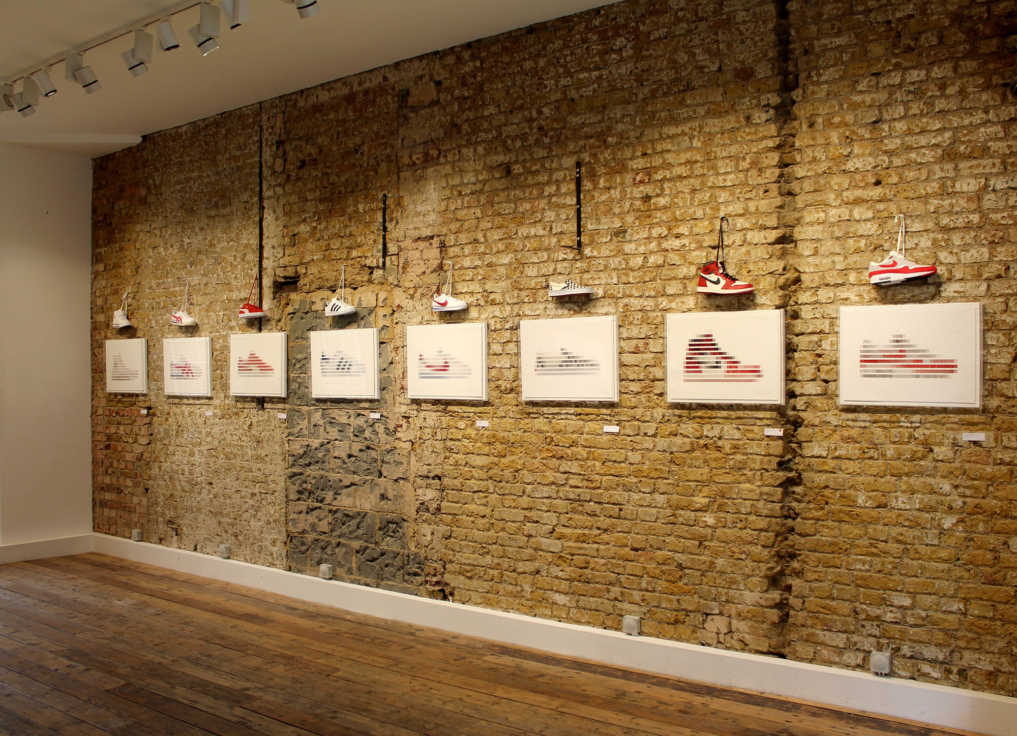 The exhibition is divided into two parts: the ground floor features 10 limited edition prints representing the 'Hall of Fame' – sneakers that have left an indelible mark on culture and became the face of the identity for the specific scene, such as for example Vans Checkerboard Slip-ons for the Skater scene and of course iconic Air Jordans.