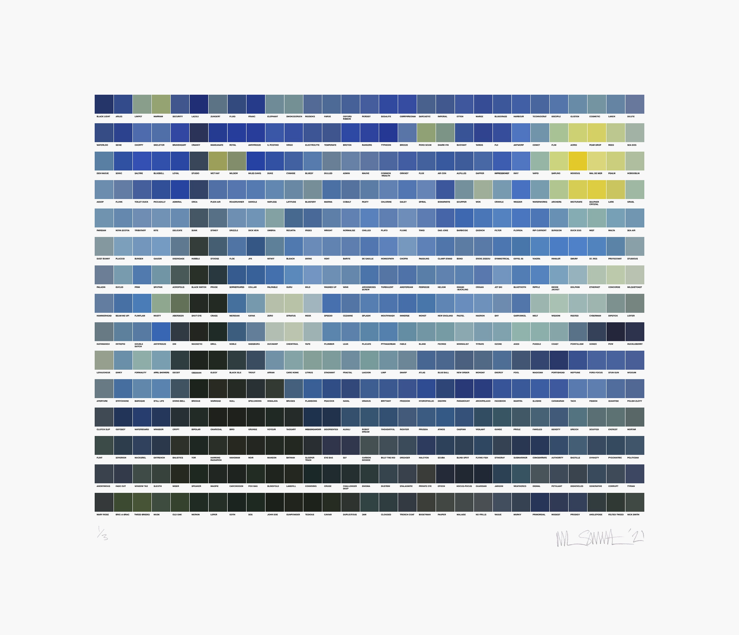 His most recent collection reimagines the impasto landscapes of Van Gogh through Smith’s recognisable pixelated style. Meticulously assembled pigment swatches are carefully titled, showing a deep understanding of colour theory and attention to detail. These works can be discovered in his current exhibition, Paracosm, at Rhodes Contemporary Gallery. Smith operates in a unique form of visual communication, consciously engaging colour, tone, and language in a way that subverts traditional genres of artistic practise. Find limited prints of his work here, at Rhodes Editions.