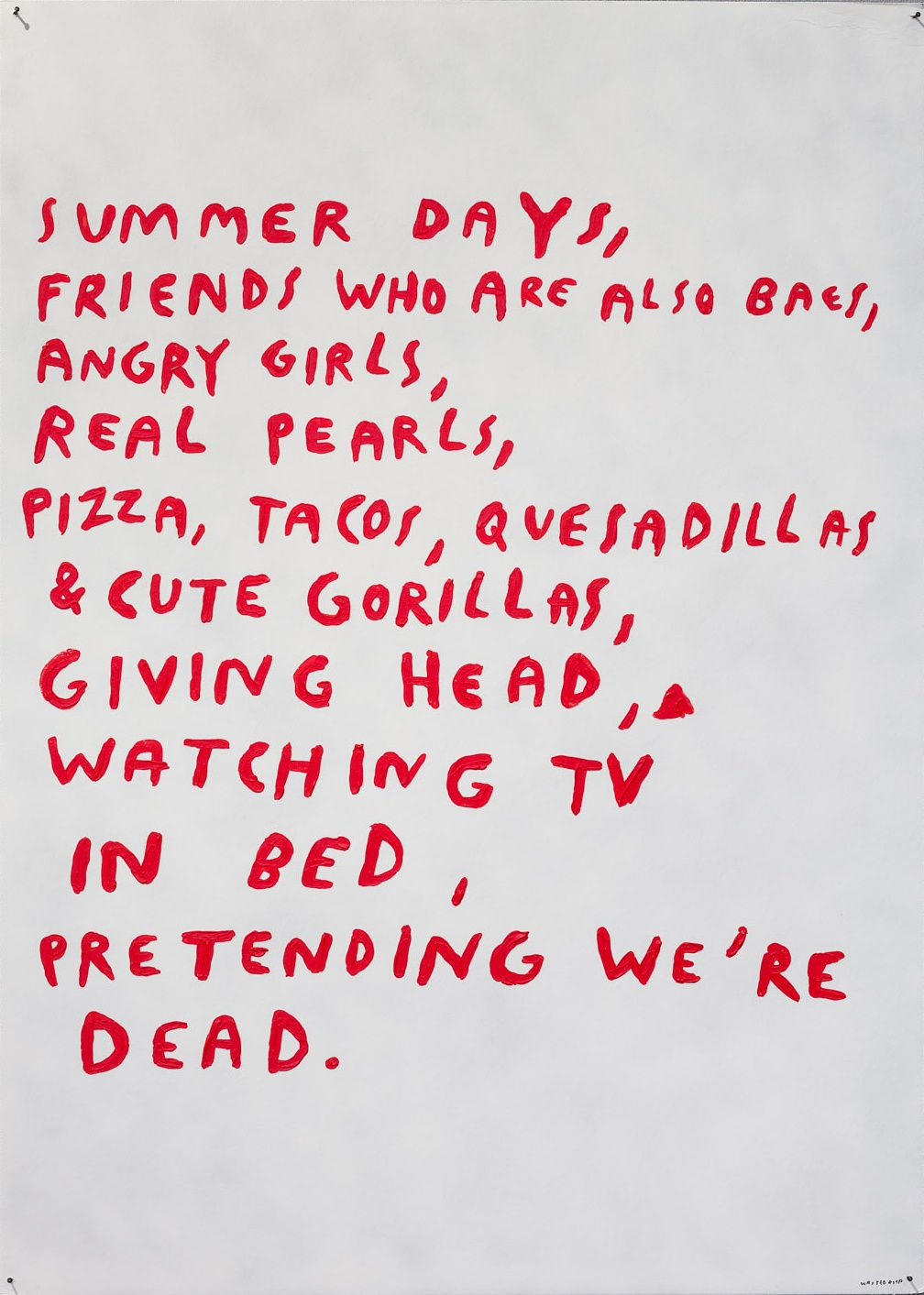 Her practise is confessional, voicing funny, intimate, and inappropriate thoughts that every viewer can relate to in some respect. Her use of profanity and blunt language is one of the defining features of her work, pushing the boundaries of acceptable discourse and societal expectations of ‘fine art.’ The choice of words in her typography serves as a direct and unfiltered commentary on various aspects of contemporary culture, including social expectations, consumerism, and the art world itself.