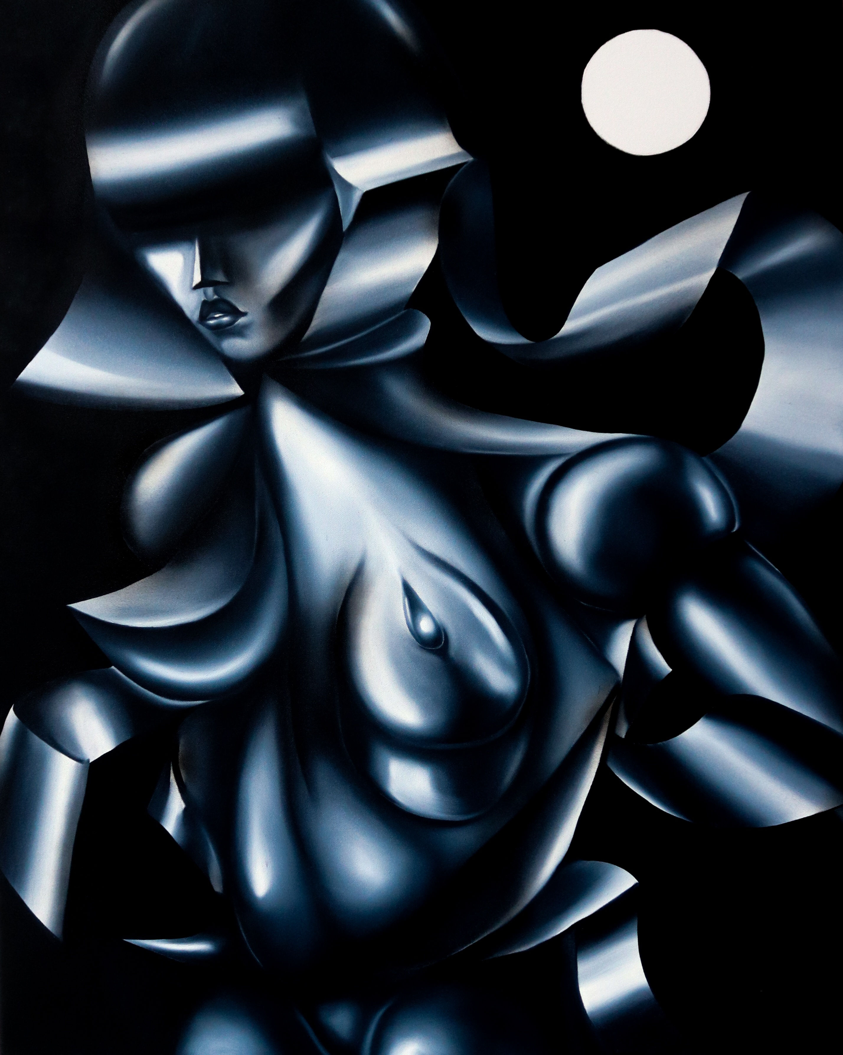 In Marius Seidlitz’s works, he uses tones and highlights of a particular hue to emphasise the smooth, shiny texture of the figures and bring attention to the surrealist nature of the imagery. The accentuation of beauty that the monochromatic nature creates, demonstrates the pervasive theme of sexuality within his works. Elongated necks, large voluminous lips and the sultry gazes of Westernised beauty standards are questioned by his restriction of colour. Seidlitz experiments with monochrome in black and white as well as in tones of colour, you can see this in his piece 'Nothing Gold Can Stay' (2023).