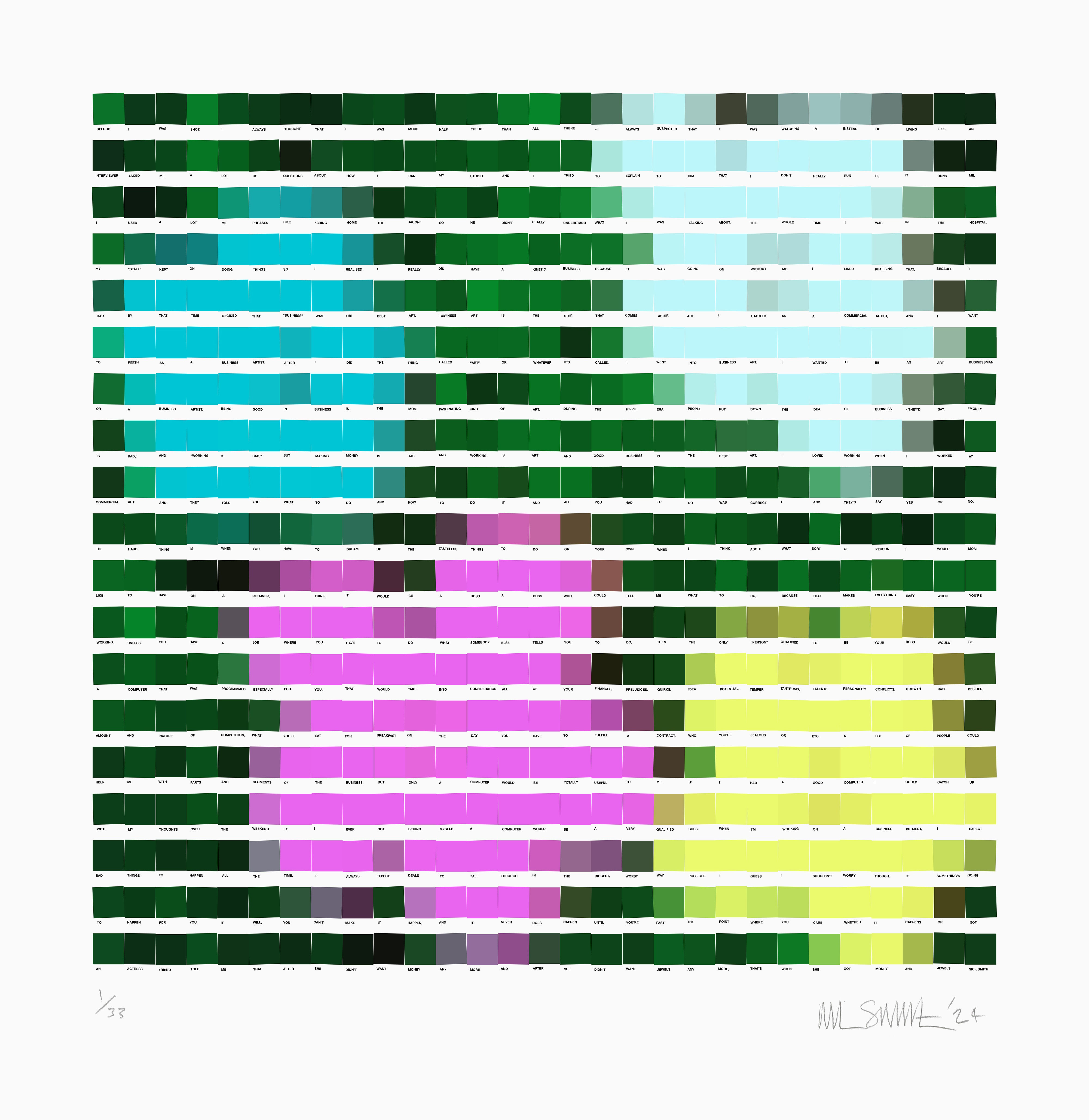 Smith's journey into pixel art began as a playful pastime, arranging colour swatches into patterns and rudimentary images. "Before diving into the art world, my background was in design, where colour swatches were a staple for referencing hues," he recalls. "My aim is to maintain a lively interaction with the audience, merging fine art with elements of popular culture."