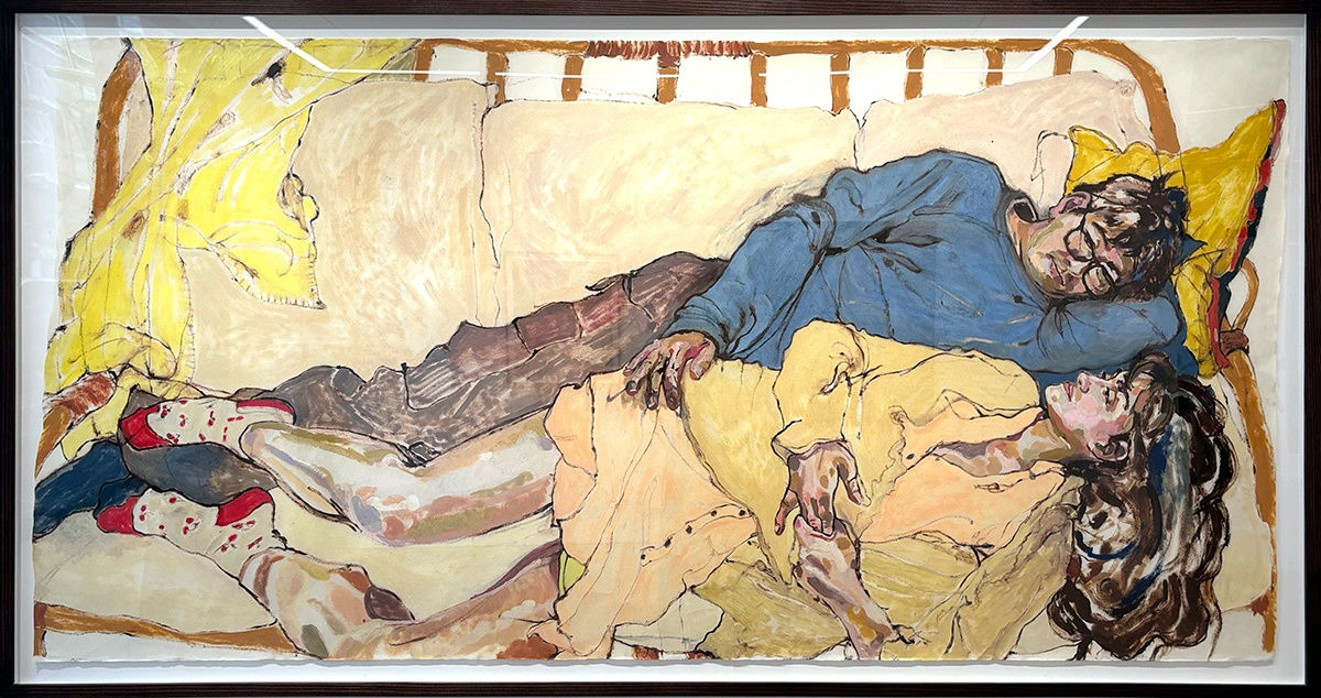 Caister also utilises the compositions of her figures to reflect this same openness to exploration of the human condition. Her figures are often depicted lounging, draped over a sofa or bed, at ease and relaxed. Many of her figures are also depicted with a vacant expression, calmly allowing the onlooker to take them in and observe them. Her composition reflects the tenderness of her work and the people it depicts.
