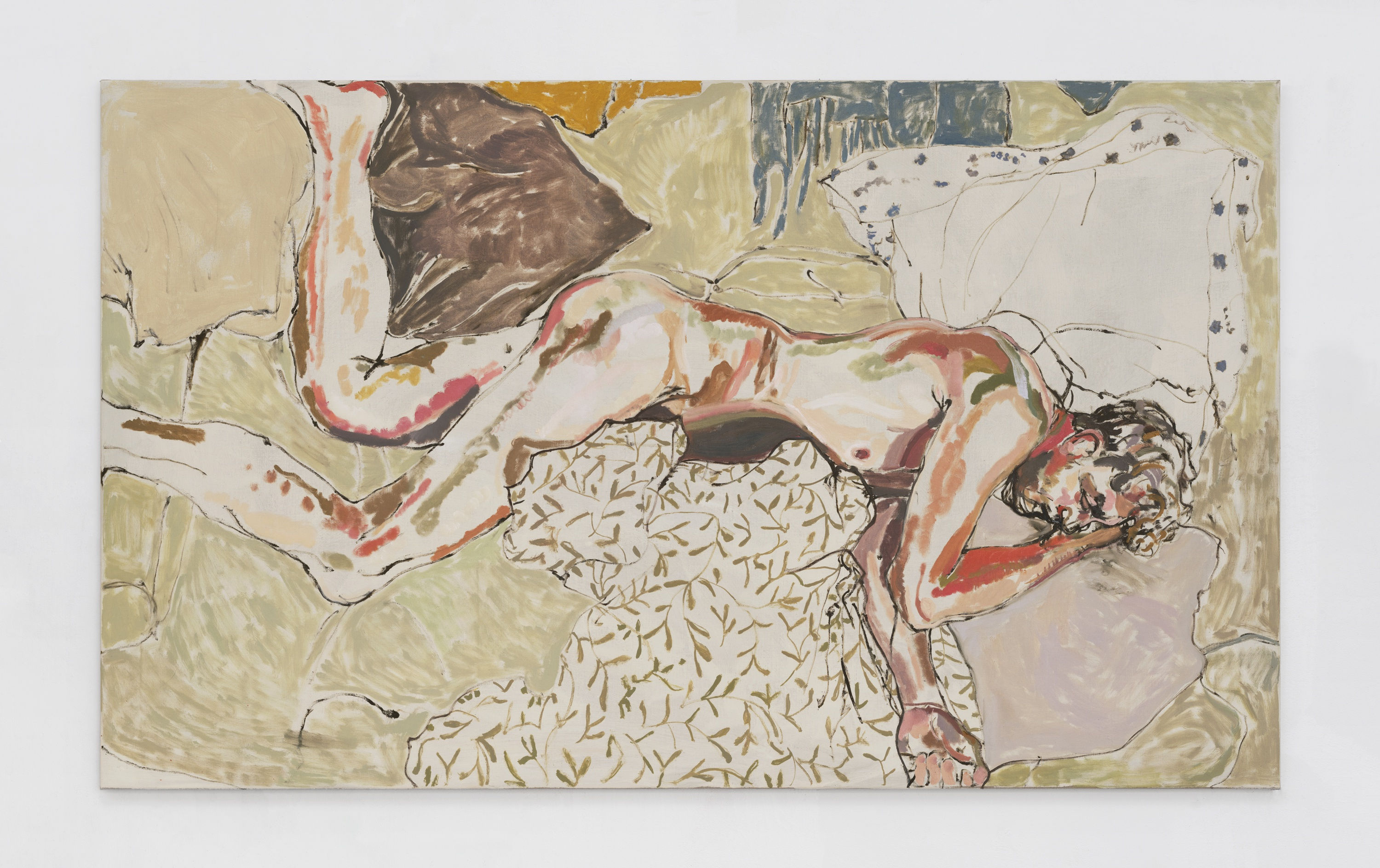 In her latest body of work Peacetime, Caister explores figures in repose, every one features a reclining body. The works are decidedly domestic in nature but the intimacy the artist achieves and the fluidity of her line mark them out as pictures with a quiet kind of grandeur. She somehow reminds us that this might be when we are most at one with ourselves and that there is a seriousness to healing power of being at rest. Although each one shares a repeated subject, the motif is pushed and pulled in different directions. In some the picture seems to collapse into itself, the setting becoming abstract and therefore all the more psychological. In others we feel as if we intrude upon a couple who can be completely at peace with one another in silence.