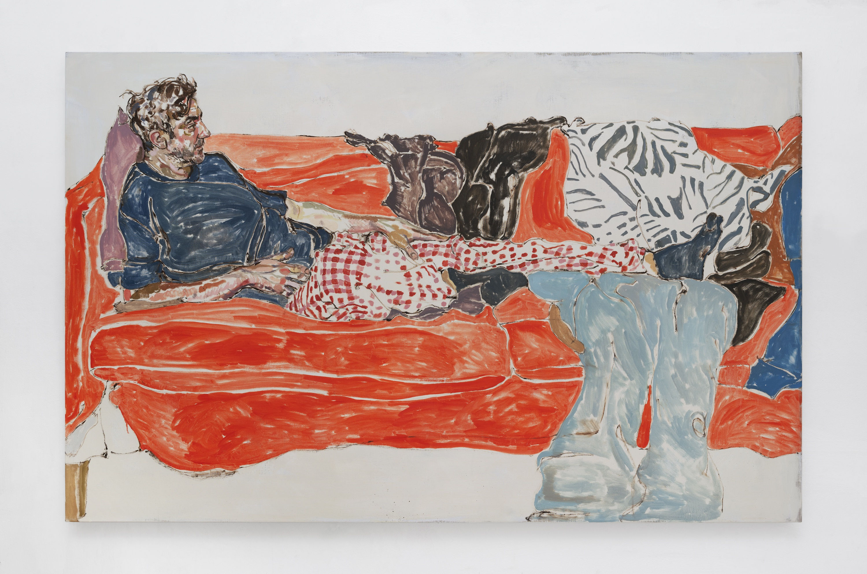 Caister’s sensitivity extends to her use of colour. In previous years her palette was restrained with limited colour blocking and detail, allowing the primacy of her line to streak across the surface of the paper. In these new paintings, Caister demonstrates that she has an insightful versatility for colour, in some works rhythmic pastels combine to make an impressionist scene whereas in others she manages to allow figures to happily co-exist instead of being drowned out by a well-worn richly red sofa. It is also exciting to see patterns come into play and the realities of a home with dishevelled blankets and discarded clothes treated with a magnificently lazy kind of beauty. Although they might be described as mundane, the additions of these details is important as they remind us of the chaos of life which Caister holds at bay at the edges of her scenes.