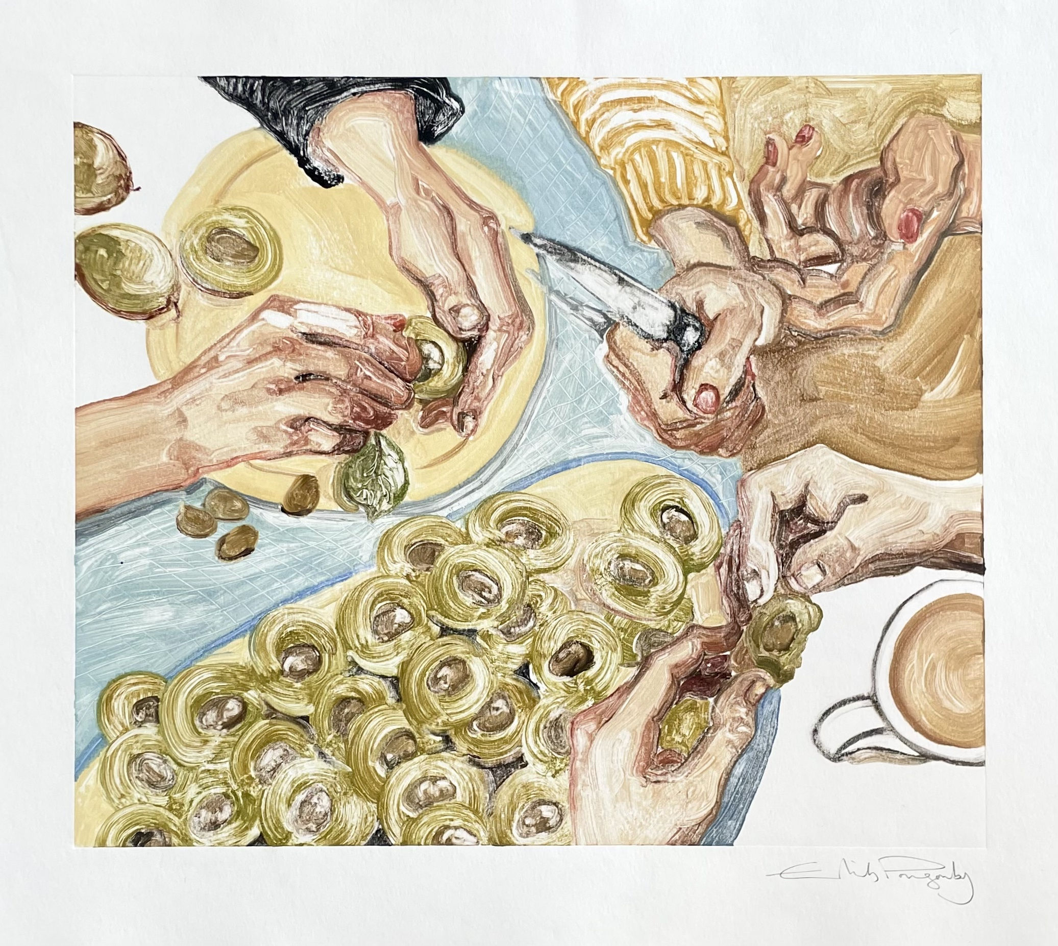 A third highlight of the show is Emily Ponsonby, an artist whose printing technique is based on the Ancient Egyptian encaustic process, which involves buffing and scraping pigment into layers of beeswax. Ponsonby’s engagement with monoprints for this exhibition has resulted in works that evoke memories of holidays due to their faded quality. This effect is achieved by the brushstrokes that both apply and remove the paint from the plate. In ‘Stoned’, the marks that form the fruit are echoed in the depiction of the hands, table, and coffee, connecting each element of the piece as part of a memory.