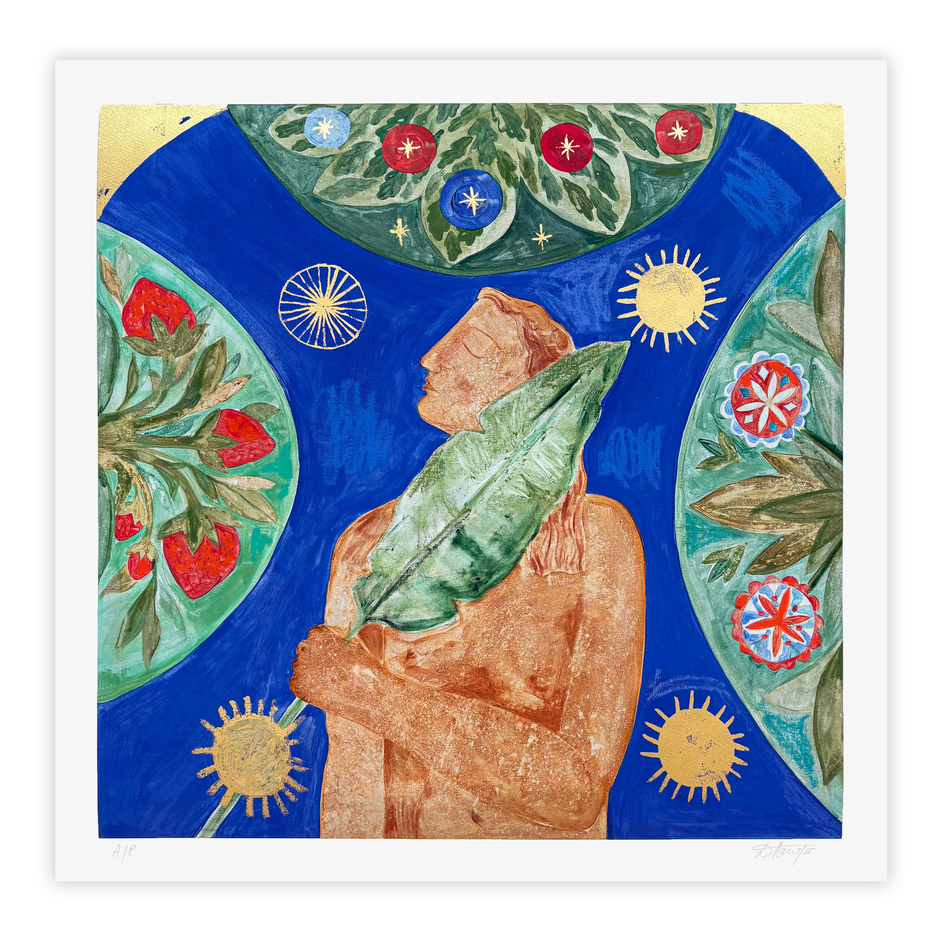 All effort has been put into ensuring the texture of the original is replicated in the print. This includes the gold leaf on the suns, some featuring the artist’s scratches, removing the leaf from the canvas. This has been translated in the edition: along with the gold leaf, adding depth and luxury to the work, it is only applied exactly where she has let it remain in the original artwork.