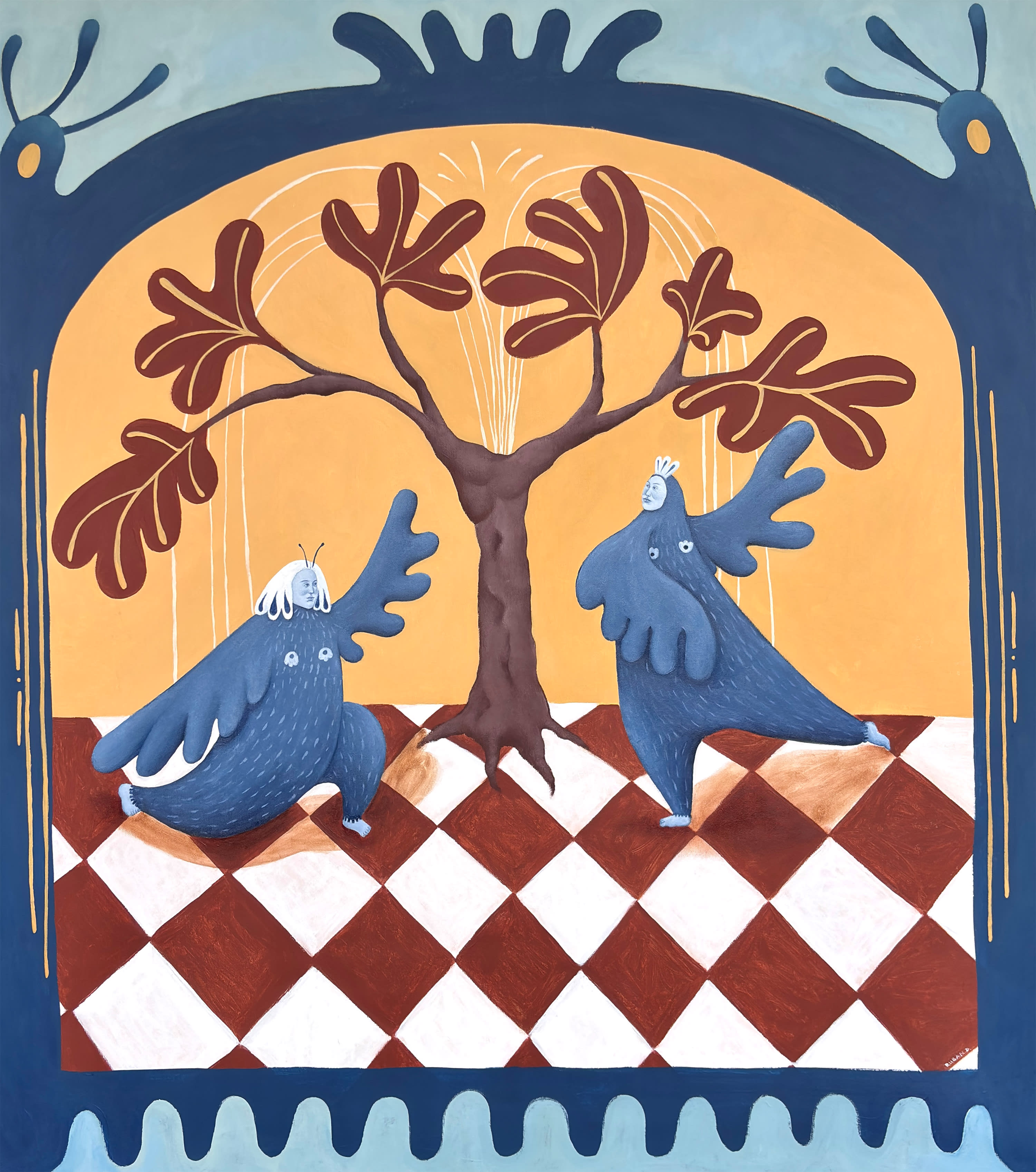 Ruban is a Ukrainian artist whose works layer symbolic imagery onto sculptural and painted forms. Often centred on a recurring blue, feminine figure, her work blurs the line between devotion and self-portraiture, becoming a personal iconography rooted in folklore and spiritual meditation.