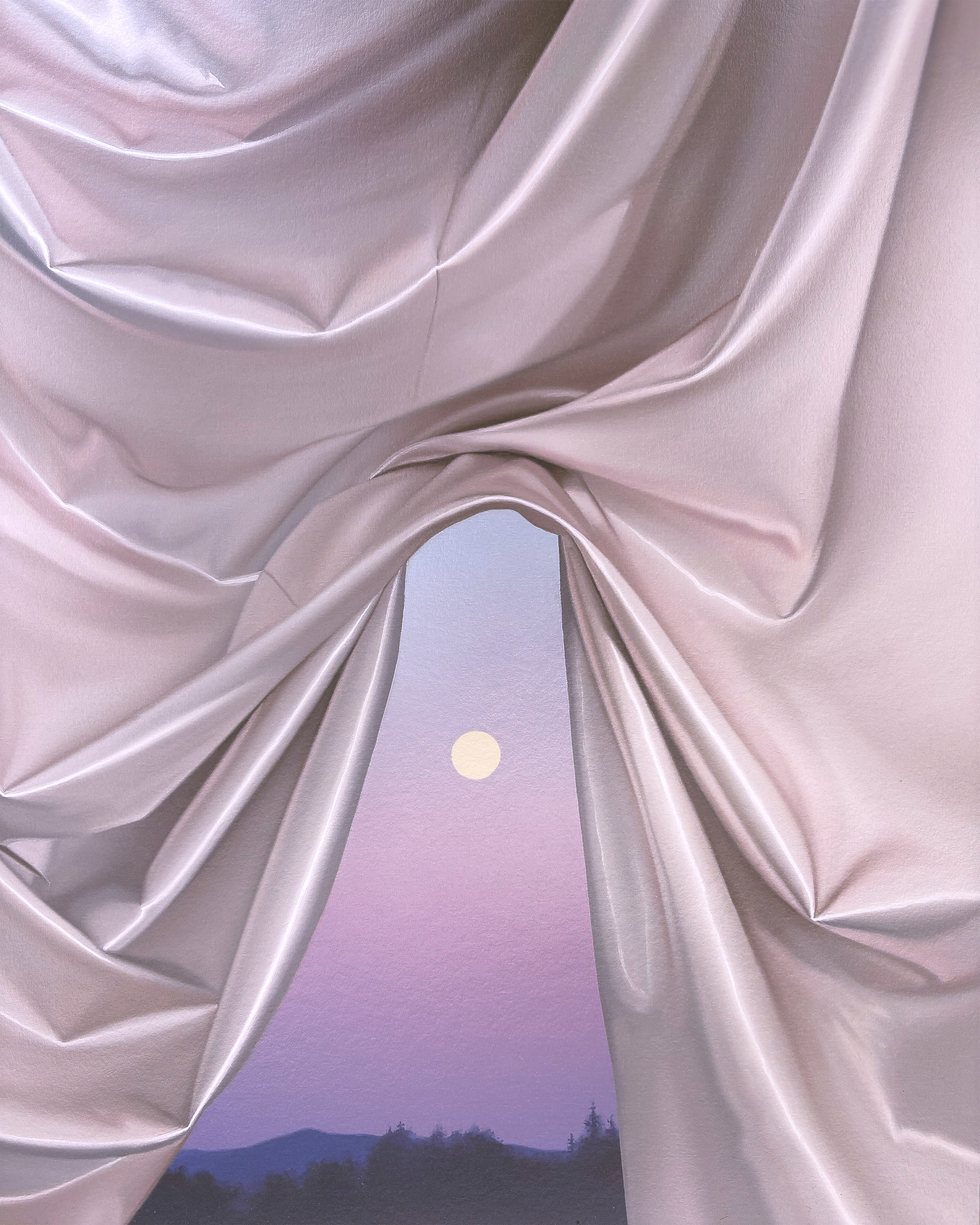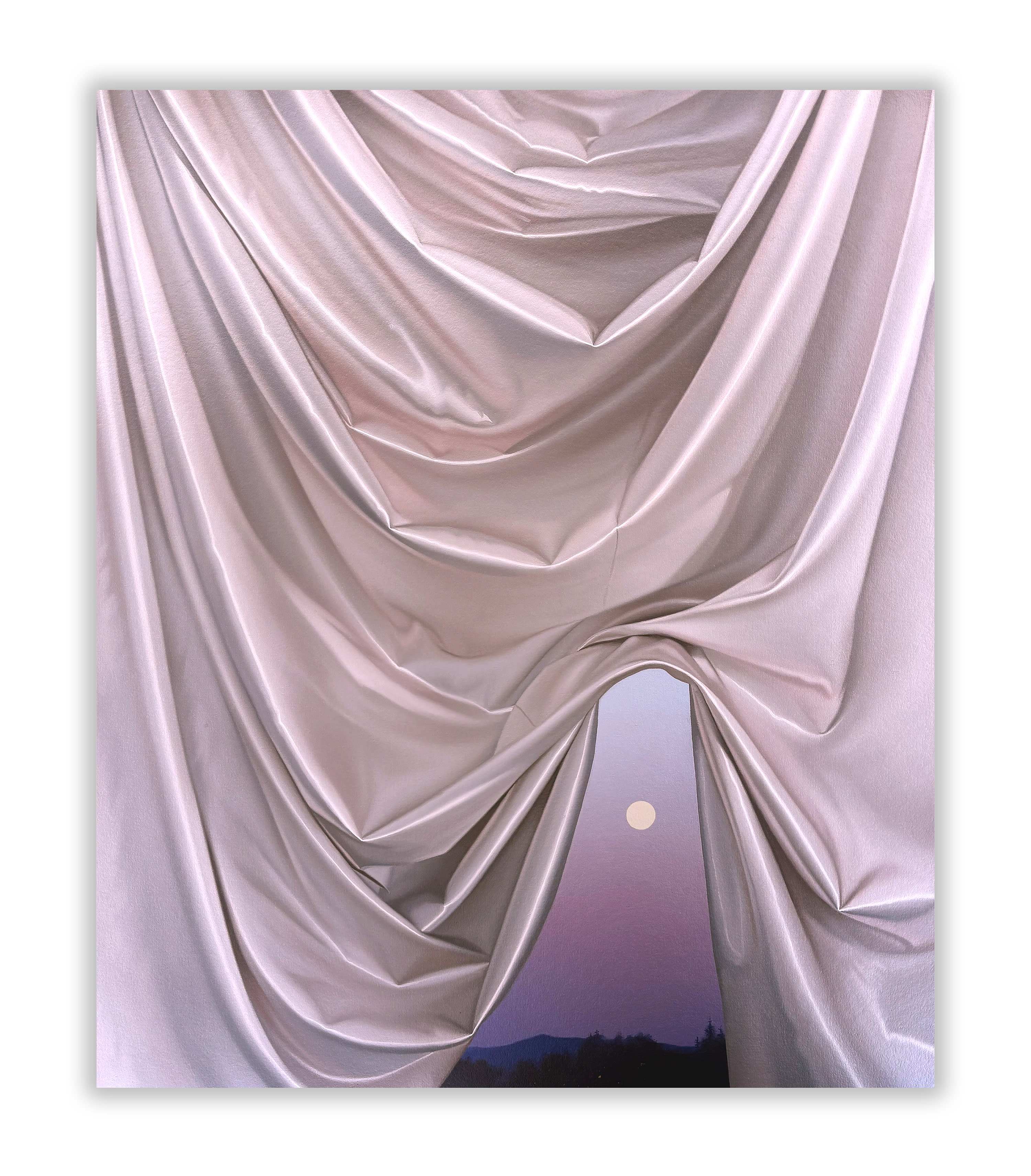 Huckins is known for his alternative approach to depictions of the natural world, layering swathes of fabric over landscapes. His meticulous approach to the fabric is essential to his work, creating fabric so realistic that the viewer can imagine touching it. It was essential to translate this detail and depth in Beaver Moon accurately, and this has been achieved through printing the edition on Hahnemühle Photo Rag Metallic Paper. This reflective depth mirrors the artist’s approach to soft moonlight and fluid drapery, giving the edition a luminous quality and depth that echoes the original painting.