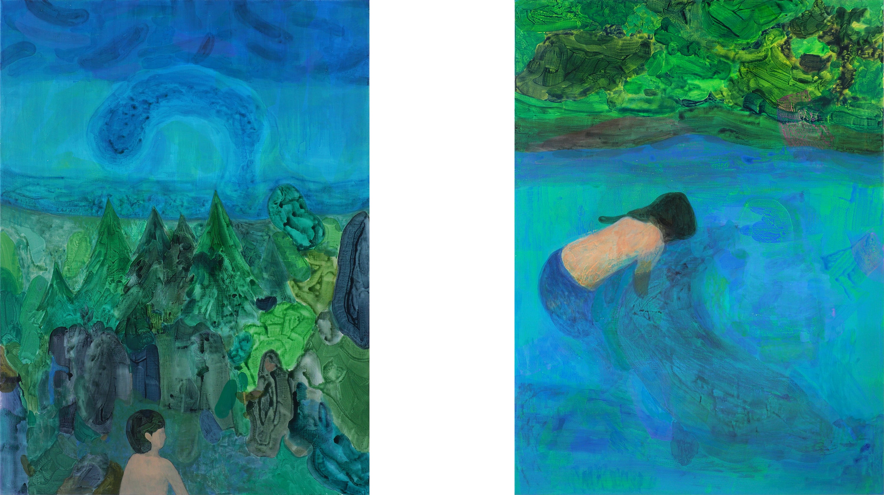 Akiyama’s technique is rooted in his combining of control and chance, just as water flows. Layers of watercolour and acrylic paints are painted over one another, with Akiyama giving them free rein to separate and merge where they please. Many of his figures appear half-submerged, their outlines softened by the water’s surface. This both anonymises their identities, allowing the viewer to put themselves in the landscape, but also creates a sense of dynamism that mirrors the materiality of water. Underwater Shadow I and II exemplify this technique, with the figures’ bodies slowly merging with the water around them, just as the water meets the green landscape.